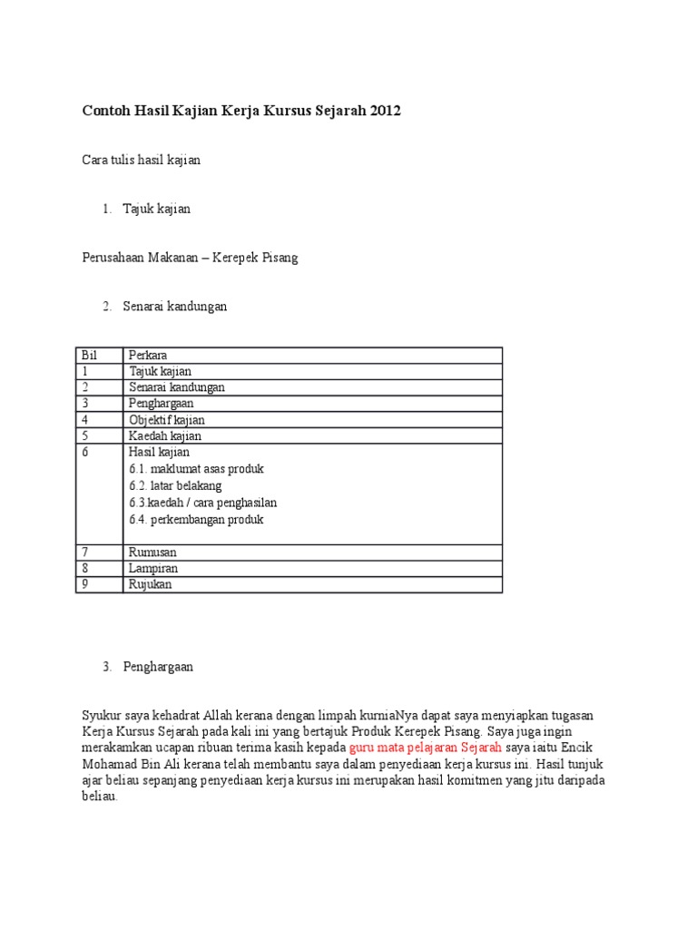 Contoh Kerja Kursus Bahasa Melayu Tingkatan 6 Penggal 3 2015 STPM Frasa Nama Dalam Akhbar BERITA HARIAN. Contoh kerja kursus pengajian perniagaan bi l isi kandungan muka surat 1 tajuk 2 penghargaan 3 abstrak 4 isi kandungan 5 pengenalan 6 objektif kajian 7 latar belakang kajian 8 kaedah kajian 9 dapatan kajian 10 rumusan 11 rujukan 12 lampiran penghargaan 1 k a j. Syukur saya kehadrat Allah kerana dengan limpah kurniaNya dapat saya menyiapkan tugasan Kerja Kursus Sejarah pada kali ini yang bertajuk Produk Kerepek Pisang.